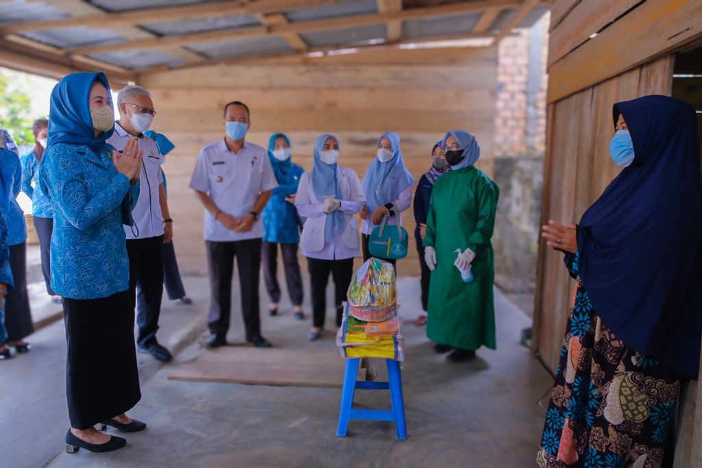 SEKAYU,SKR168.COM – Mengenakan seragam TP PKK Muba, Hj Thia Yufada Dodi Reza didampingi beberapa pengurus TP PKK Muba, Senin (16/8/2021) pagi mendatangi kediaman sejumlah warga yang melaksanakan isolasi mandiri (isoman) di wilayah Muba.