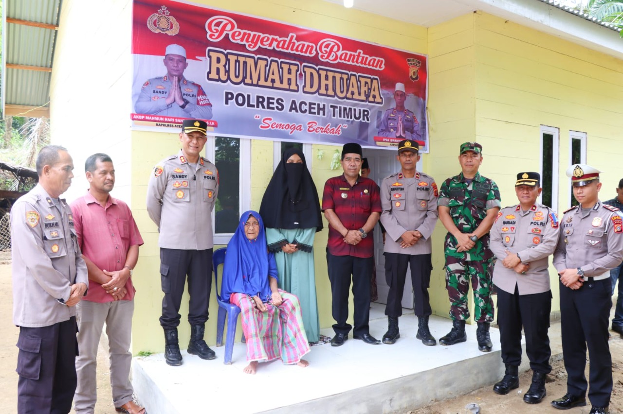 Penyerahan rumah layak huni dilakukan langsung oleh Kapolres Aceh Timur Polda Aceh AKBP Mahmun Hari Sandy Sinurat, S.I.K. disaksikan sejumlah pejabat utama polres, Muspika Kecamatan Idi Tunong dan perangkat desa serta tokoh masyarakat Desa Alue Lhok.